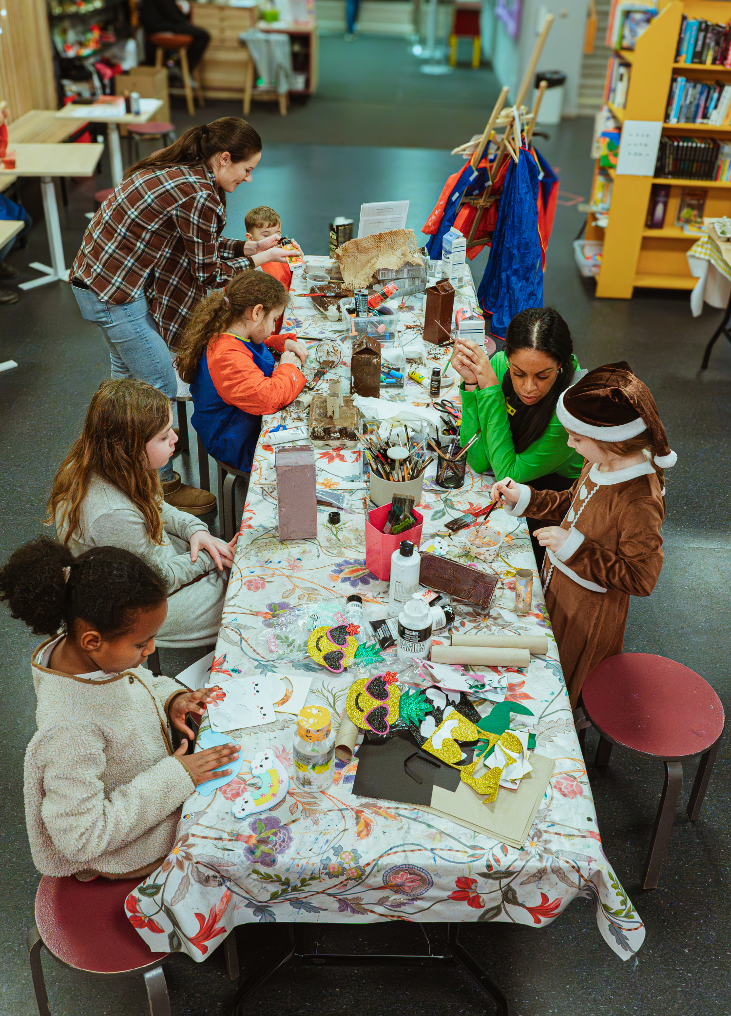 Det går alltid att måla, rita och bygga i kartong. Det finns även en maskeradhörna, spel att spela och böcker att läsa eller låna hem.