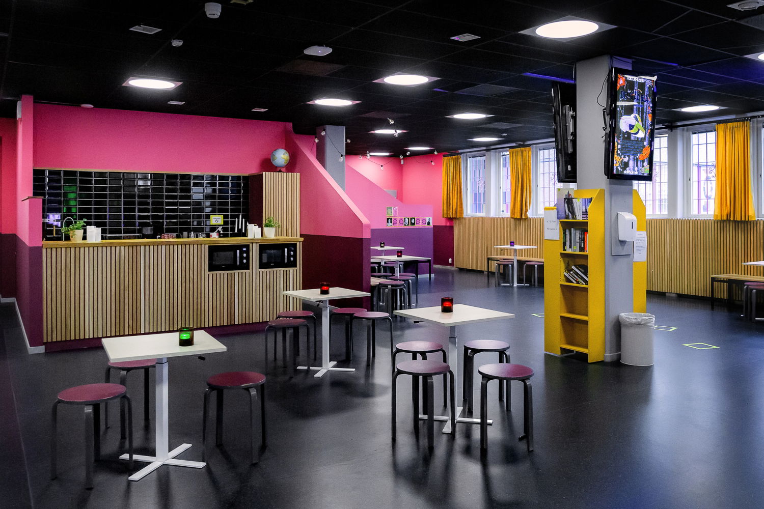 I den stora och rymliga bemannade foajén finns det plats att hänga av sig, lämna barnvagn, värma medhavd matsäck i microvågsugnar, ta med fika och sitta vid bord, det finns toaletter med skötbord och publikvärdar som är där för er.