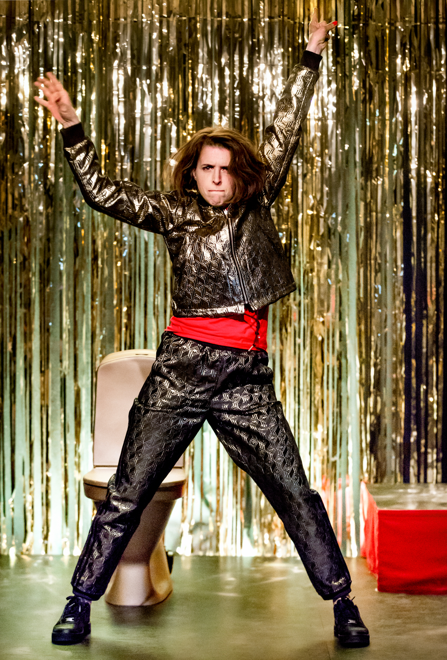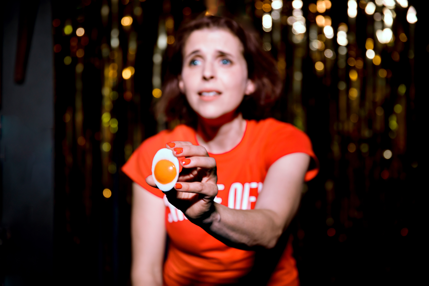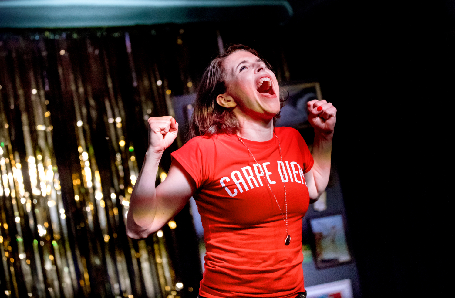 Maria sitter inlåst på en toalett på en lunchrestaurang. Hon har satt en ägghalva i halsen och kan inte andas. Ändå kan hon inte förmå sig att gå ut i matsalen och säga ”Ursäkta att jag stör… men jag dör”. Det är ju skämmigt. Hon förstår att hon håller på att dö. Men det blir inte svart. Det blir musik. Det blir guld. Det finns en föreställning till. En revy som passerar, den revyn är Marias liv.